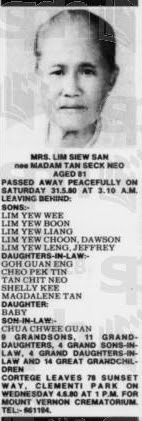 Her husband, Lim Siew San (late Government Treasury pensioner) passed away at the age of 78 at his residence, No 463-X Lorong Low Koon, off Upper Serangoon Road on 10 March 1961 leaving behind his wife Madam Tan Seck Neo, 5 sons, Lim Yew Wee, Lim Yew Boon, Lim Yew Liang, Lim Yew Choon, Lim Yew Leng and 1 daughter, Baby Li, 3 daughters-in-law and 1 son-in-law, Chua Chwee Guam 14 grandchildren. Mr. Lim Siew San is one of the sons of Mr. and Mrs. Lim Koh Seng.
