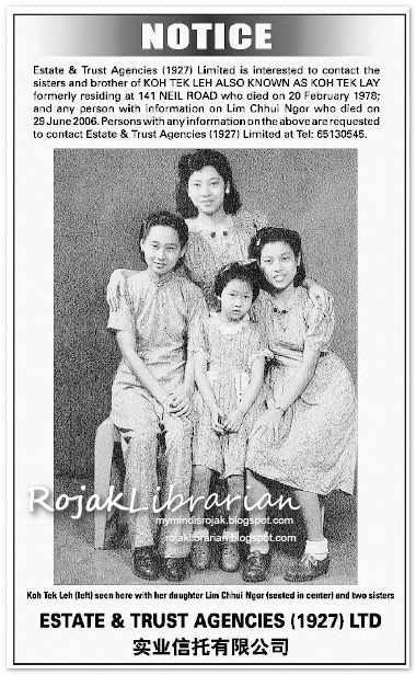 The family home mentioned in the will of the late Mr. Lim Yew Teok, was the home in 1983 where retired lawyer, Mr. Chng Kiat Leng passed away. (Chng Kiat Leng is one of the sons of Mr. Chng Pee Lam and Madam Lim Chye Inn ). Chng Kiat Leng was also the administrator and executor of the late Madam Chan Mei Tuan estate.Chng Kiat Leng was born at the family home in 1924 and graduated from Harvard in 1949 with a first class honours degree in economics. He worked with the Oversea-Chinese Banking Corporation before going into real estate where he built 10 bungalows at Fernhill and Ridout Road. He went on to Cambridge and Lincoln's Inn to study law. He passed away at the house due to hear failure on 30 March 1983. The person who was staying with him at the time was no other than Miss. Lim Chuui Goh who was in her 40s at that time. Unaware that he was dead, she stayed with his body until Mr. Chng's close friend, physiotherapist Miss. Ruth Chia raised the alarm 24 hours later. The furniture in the house estimated to be valued at $95,000 was almost auction off but fortunately stopped by the Estate and Trust Agencies of Collyer Quay who represents Mr. Chng's educationally subnormal niece, Miss Lim Chuui Ngoh.