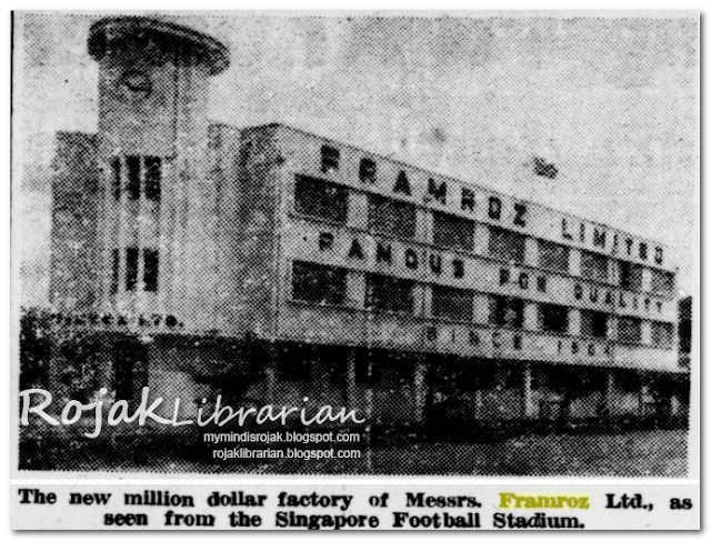 In 1954 The Golden Jubilee or 50 years of progress of Messrs. Framroz Ltd was celebrated at his factory premise, opposite Jalan Besar Stadium). The new factory is a 3 storeyed building with a total floor space area of 50,000 sq. feet with the latest machinery that sterilises the bottles before filling it. The Aerated Waters Factory and Ice Works and their Crown brand product are under the immediate supervision of Mr. P.M. Framroz. The factory is able to manufacture carbonated and non-carbonated beverages such as Fruit Juices (Crown Orangia and Crown Pine Smash. The orange juice used in their orange smash and non-carbonated Orangia is imported from California, Spain, etc and the Pineapple Juice is the Malayan Product extracted and supplied by Pineapple Canners Messrs. Chuan Seng and Co. of Singapore. It also own an iceworks factory that produces 18 million pounds of ice annually or 50,000 punds everyday supplying to fishing vessels, Army, hotels and services nearby.